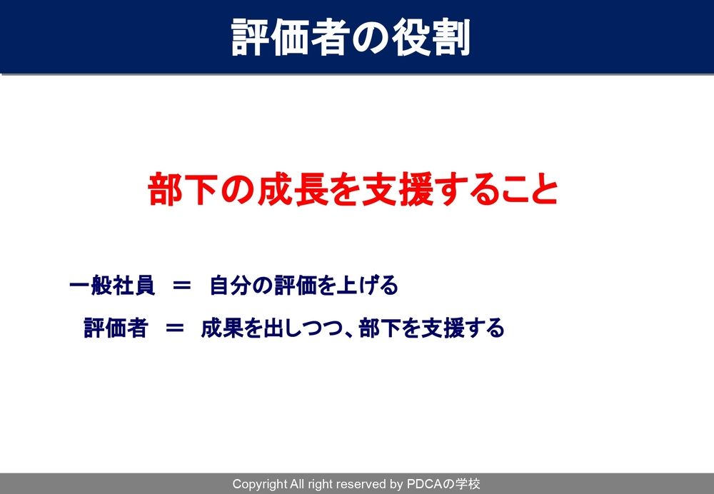 なぜなのかと言いますと、評価者と言われる方々の役割の中に入っているのが、会社の目的・目標の達成とか、売上の向上が1番に入ってくるとは思うんですけども、「部下の成長を支援すること」です。