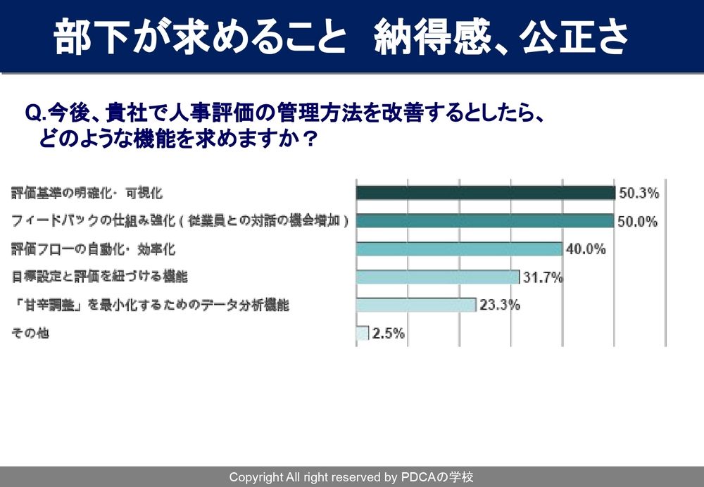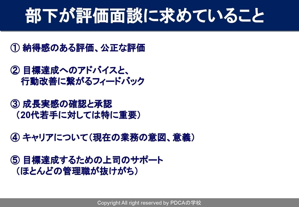 (スライドを示して)部下が評価面談に求めていることもお見せできればなと思うんですが、だいたいこのあたりです。