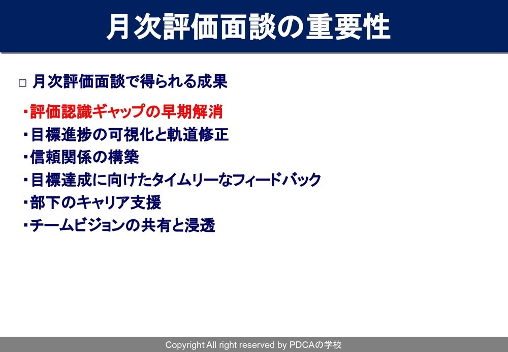 「評価認識」「ギャップの早期の解消」「目標の進捗の可視化と軌道修正」「部下との信頼関係の構築」「目標達成に向けたタイムリーなフィードバック」「部下のキャリア支援」「チームビジョンの共有と浸透」などです。