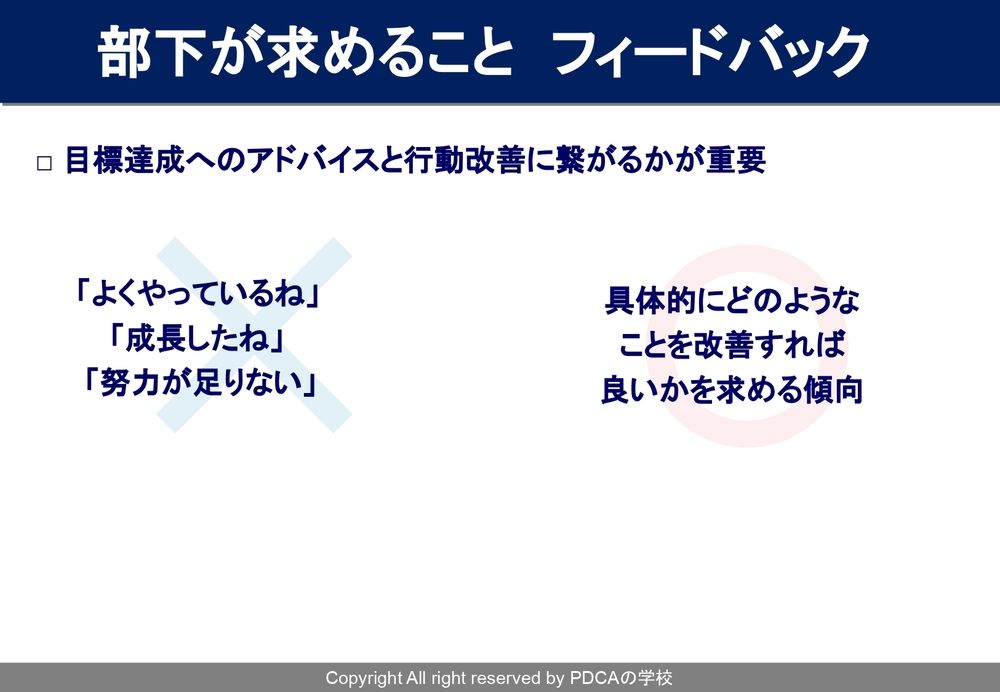 「よくやっているね。成長したね」とプラスなフィードバックを行う時も、「努力が足りないですよ」とかマイナスなフィードバックを行う時も、具体的にどういうところを改善すればいいのか? 具体的にどういうところが良かったのか? このあたりを、上司としてしっかりと伝達してあげる必要があるなと思っています。