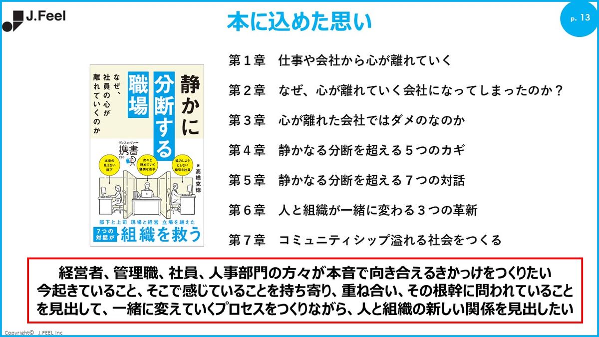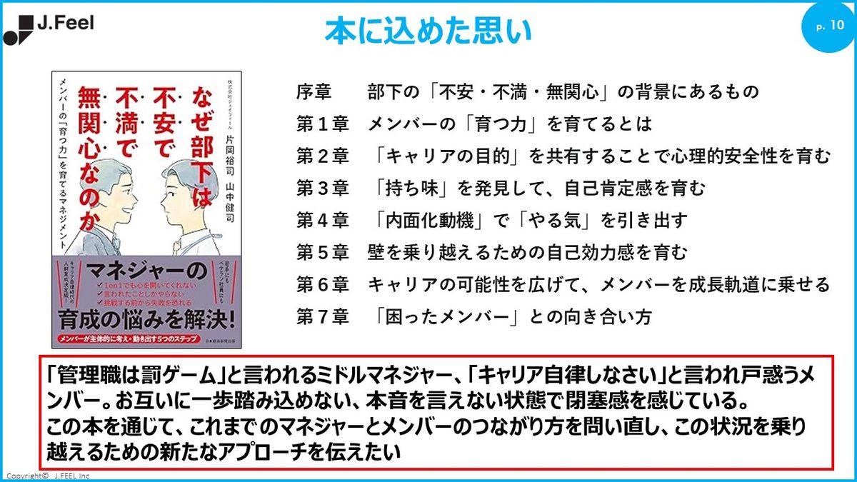僕だけが書いた本ではなくて、ジェイフィールのみんなでいろいろな思いを重ねて書いた本です。実はこの3年ぐらい、あらためてエンゲージメントってなんだろうということを探究していました。