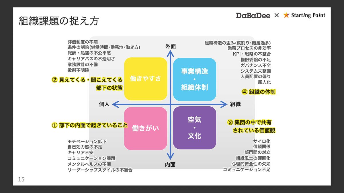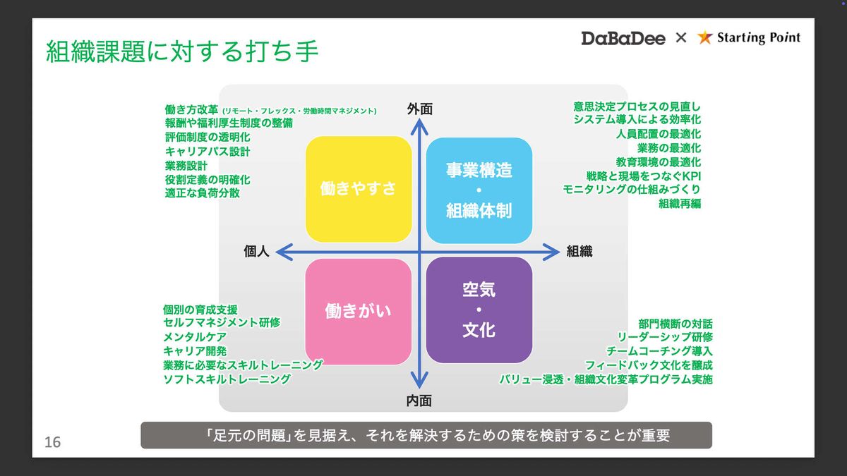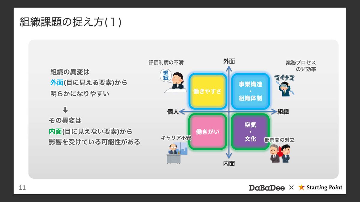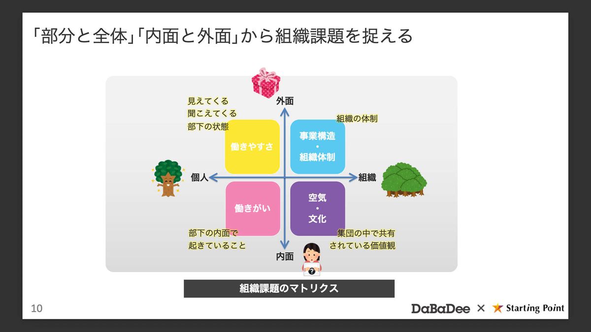 先ほどからお伝えしている「部分と全体」「内面と外面」の2軸を、そのまま縦横に配置します。縦軸は外面か内面か、横軸は組織の話なので「個人」と「組織」に置き換えます。4つに切って眺めると、社内で起きている事象が整理され、打ち手の見当がつきやすくなります。