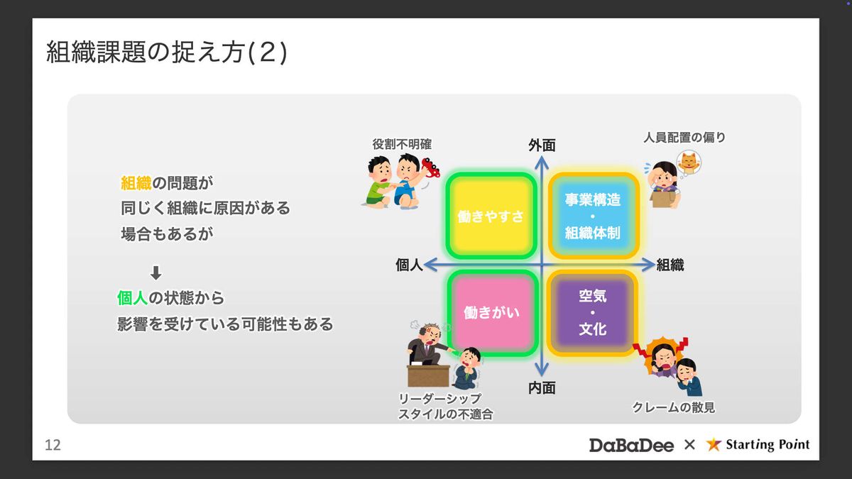 髙桑由樹氏:では、ここからは組織課題を適切に捉えるための見方を共有します。多面的に見るための道具として、マトリクスを1つ紹介します。