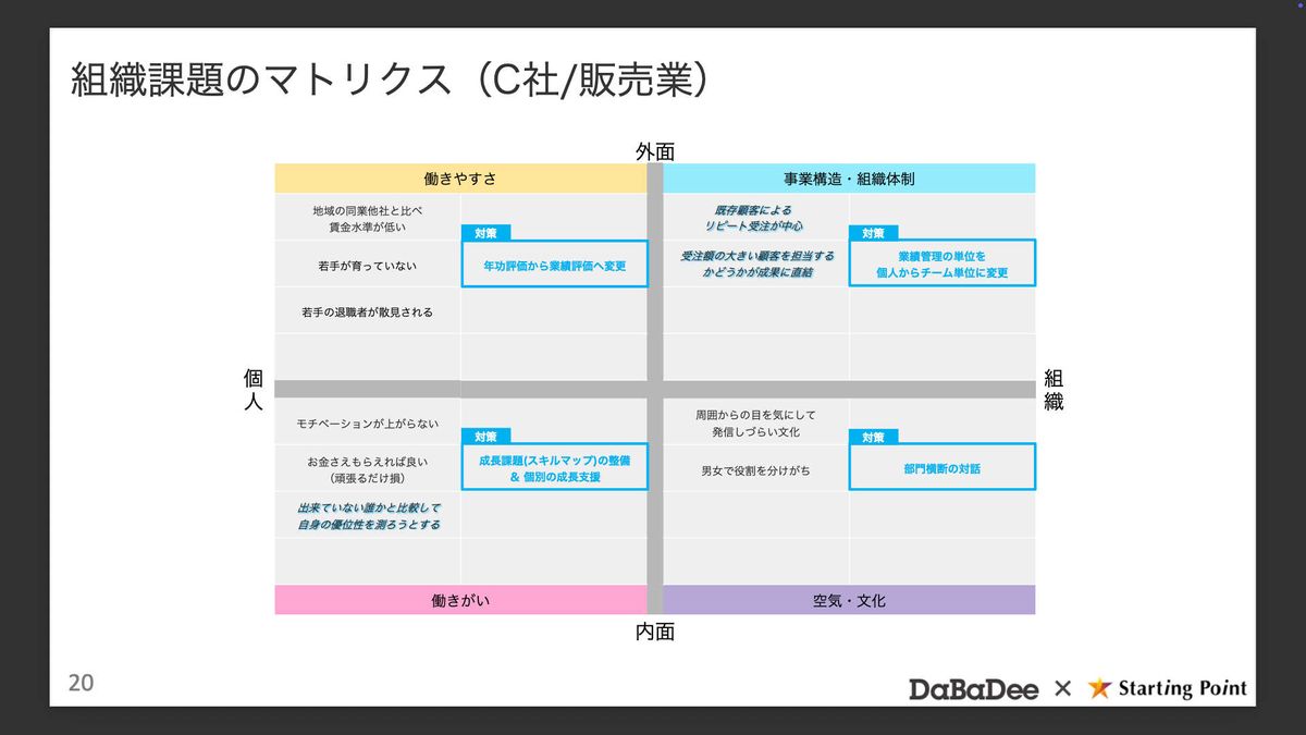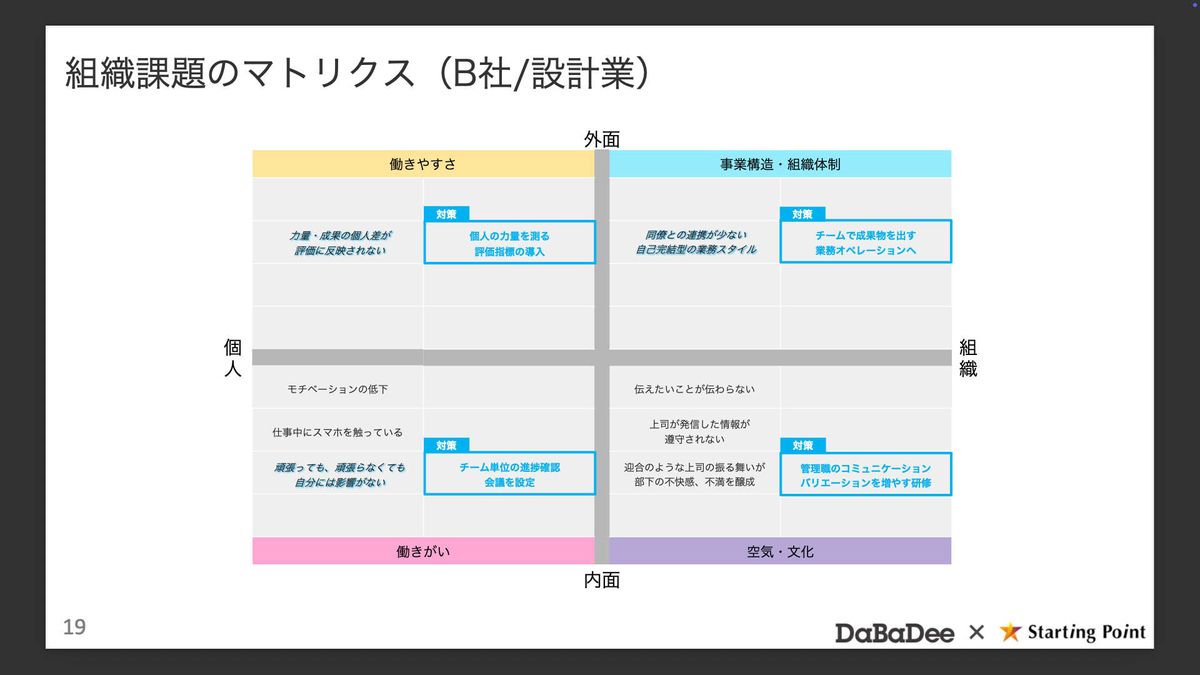 髙桑由樹氏:ここからは、実際にご参加いただいた企業の組織課題を見ていきましょう。今回は代表して3社をピックアップしました。