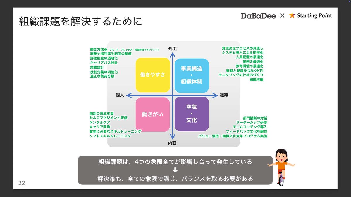 この四象限の見方は会社単位でも部署単位でも使えます。組織規模にかかわらず、課題を捉える視点は同じです。ぜひ各社で活用してみてください。以上でセミナーを終わります。ありがとうございました。
