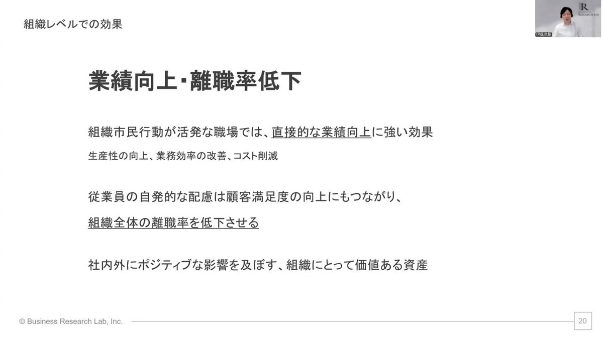 具体的には、直接的に職場レベルのパフォーマンスを高める効果があることがわかっています。組織市民行動をきちんと取っている従業員が多いほど、例えば生産性が高まったり、業務効率が改善されたり、コストが削減されたりするといったことが実際に明らかになっています。これは珍しいですよね。そのような集団のパフォーマンスを高める効果もあるということです。