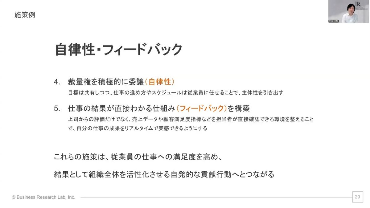 そして4つ目ですね。裁量権を積極的に委譲することです。例えば目標は共有しつつも仕事の進め方やスケジュール、計画とか、そういったところは従業員に任せていく。それによって主体性が引き出される。これを、「自律性が高い状態」と呼ぶんですが、自律性が高いと、仕事満足度が高まりやすいことがよく知られています。