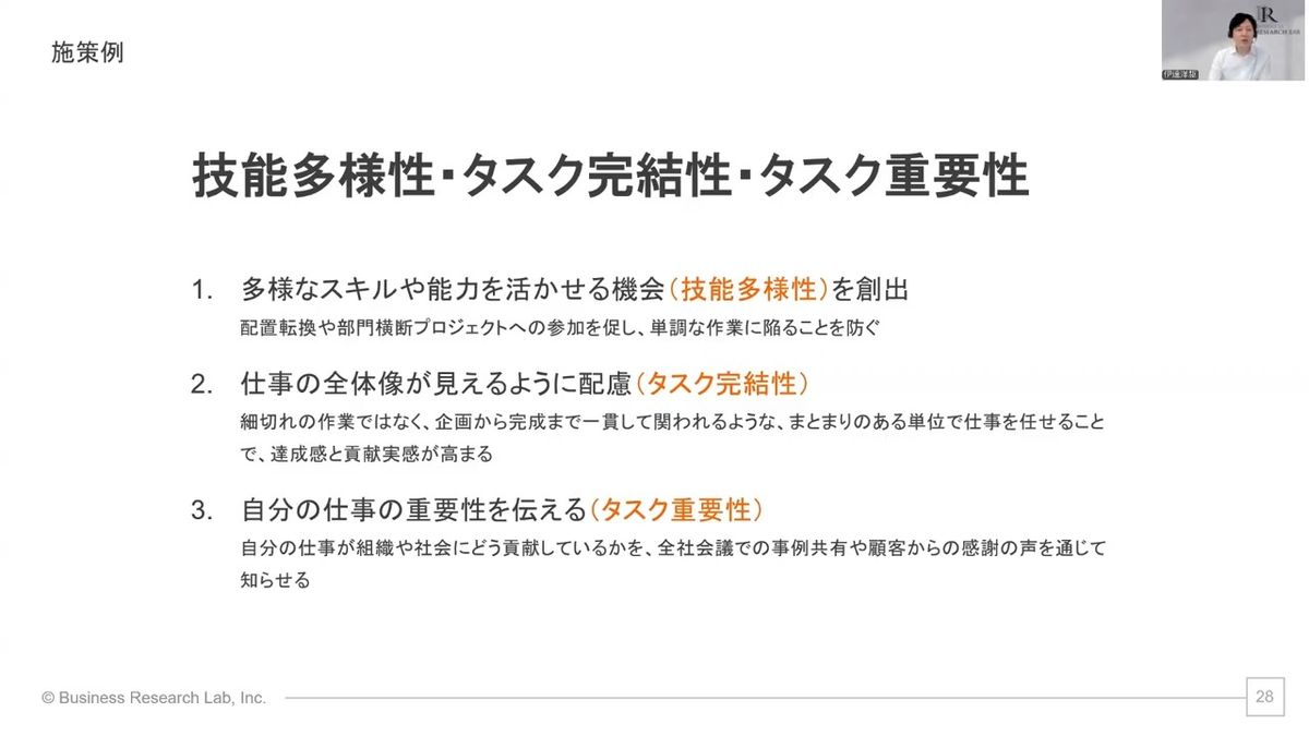 1つ目が、多様なスキルや能力を活かせるような機会を創出することです。これを専門的には「技能多様性」と呼ぶんですが、いわゆる単調な作業に陥ってしまうと、人は仕事満足度が下がるんですよね。