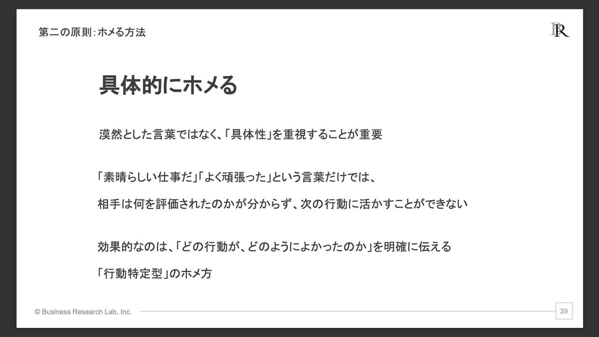 伊達:2つ目の原則は「具体的にホメる」ということです。