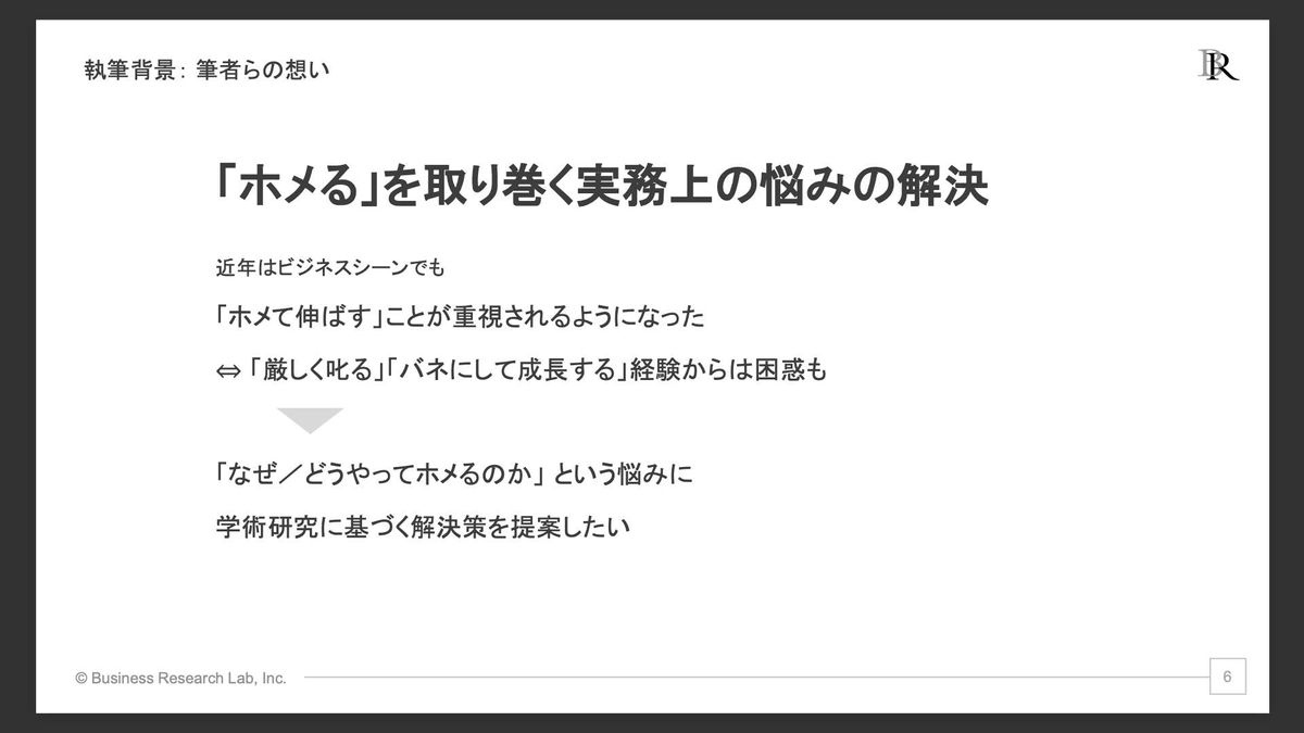つまり、なぜホメるべきなのか、どうホメればよいのか。こうした点について学術研究に基づく考え方と方法を示したいという思いが、今回の執筆の出発点になっています。