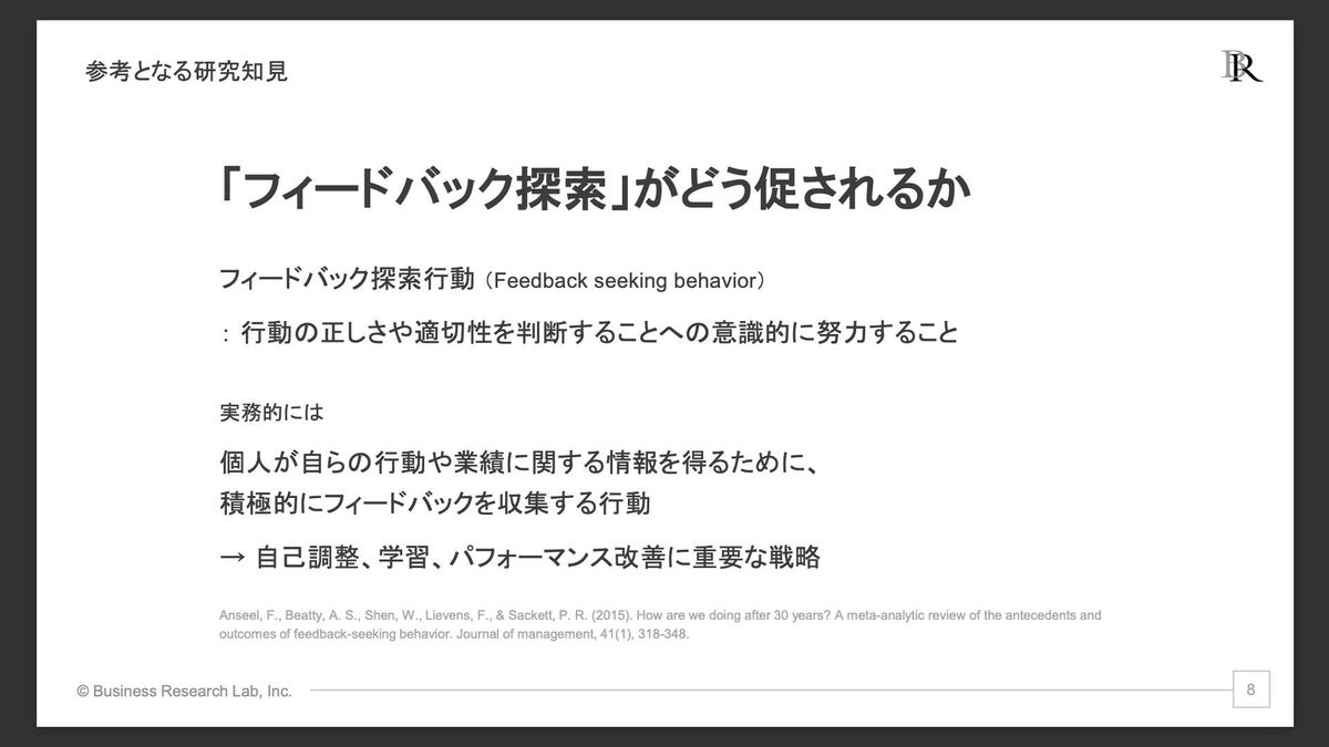 フィードバック探索行動とは、自分の行動が正しいか、適切かを確認するために、情報を積極的に求める行動と定義されています。こうした探索行動が活性化すると、必要な場面でフィードバックの要求が生じ、やり取りが適切なタイミングで成立しやすくなる、というわけです。