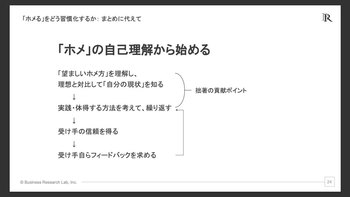 今回の書籍は、伊達からも紹介があったとおり、学術研究に基づく理論や理想的なホメ方を紹介するとともに、どのように導入していくかという工夫も多数取り上げています。詳しい内容は本書を見ていただきたいのですが、実践的かつ効果的な方法を導入するための「始めの一歩」が、まず自分の現状を把握するという使い方を提案したいと思います。