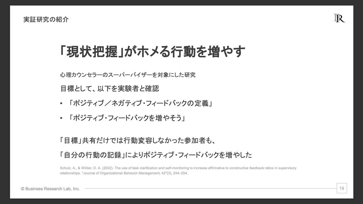 提案の前提として、現状把握の有効性を支える研究があります。自分が今どのようにホメているか、どれくらい、どんなホメ方をしているかを把握できると、ホメる行動を増やせると示した研究です。