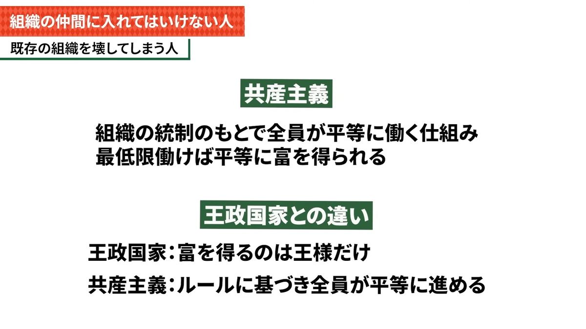 王政国家を経て、「みんなで組織でルールに基づいてやると、ある程度個人でやっているより大きなものができるよね」とわかった状態だから、共産主義ができてきたんですね。これをわからない状態で突然やっても、「嫌だ」という話なんですよね。社会主義という構造で、全員が同じルールで、全員が同じように働き、同じ成果を得るとなってきました。