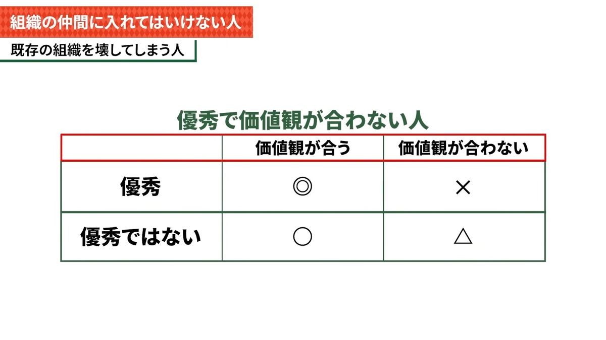 絶対に入れてはいけない人というのが、「優秀で価値観が合わない人」。表の横軸が「価値観が合う」「価値観が合わない」、縦軸が「優秀」「優秀ではない」というのがあるんですけども、ここに◎、○、×、△と付けています。