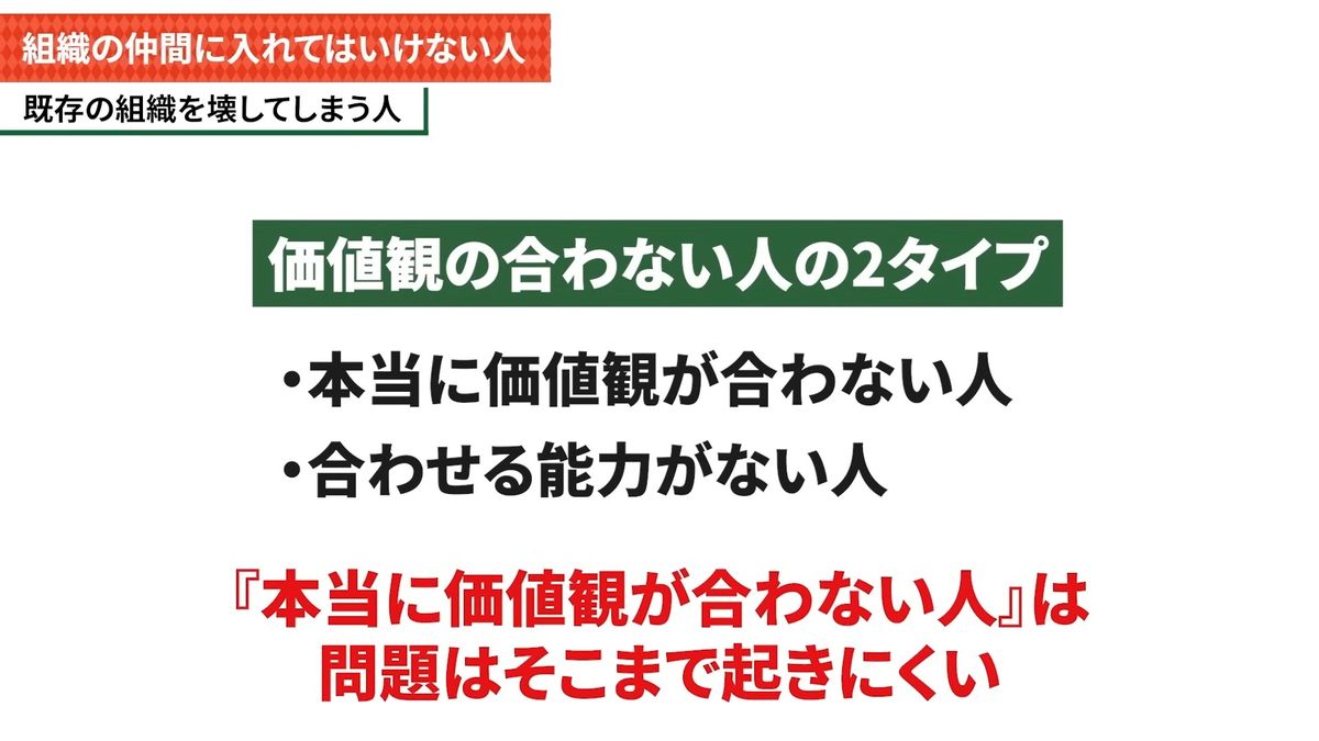 組織をつくった経験がない人が、たぶん一番入れてはいけないと思うのは、優秀ではなくて価値観が合わない人。これが一番ダメだと思うと思うんですね。でも、実はそうじゃないんですよ。優秀だけど価値観が合わない人。これが一番ダメなんですよね。