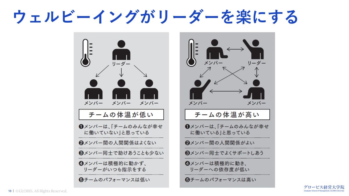 このメリットは計り知れません。(スライドの)右が、チームの体温が高い状態。どういうメリットがあるか。まず、メンバーがどんどん幸せになっていきます。まわりに幸せな人がいたら、感情って伝染しませんか? 逆に、チームに1人でもピリピリしている人がいると、それも伝染します。みんなが幸せだと、スパイラルがすごいんですよね。伝染し合って、ポジティブなスパイラルになります。