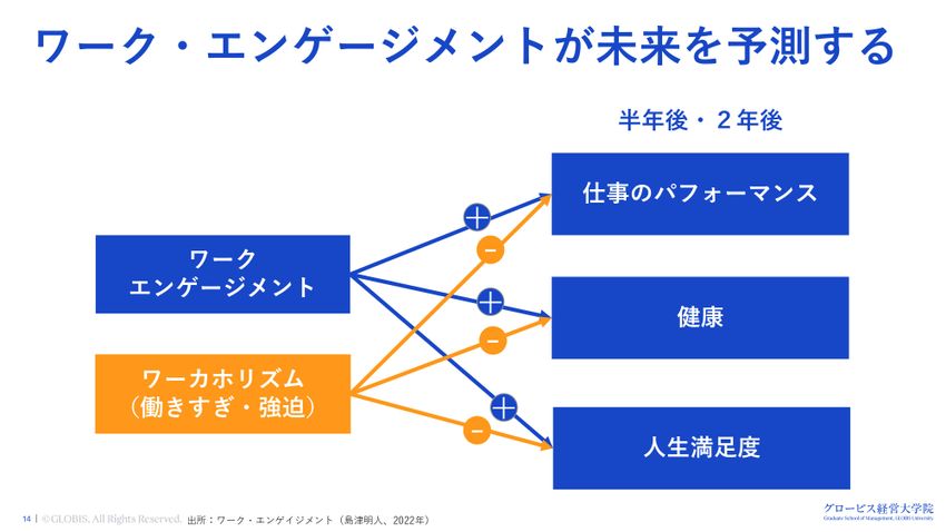 なぜこういった指標が大事なのか。今みなさんのワーク・エンゲージメントが高い場合、半年後のみなさんの仕事のパフォーマンスが上がります。健康が高まります。人生の満足度が高まります。半年後だけじゃないですよ? 2年後まで予測できるというのが、慶応義塾大学の島津(明人)先生の研究です。これは日本人に対して行われた研究です。