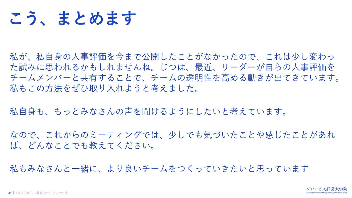 そして、こうまとめてください。「私は今まで自分の人事評価を公開したことがなかったので、これは少し変わった試みに思われるかもしれません。実は最近、リーダーが自らの人事評価をチームメンバーに共有するということが起きているんです」と話します。