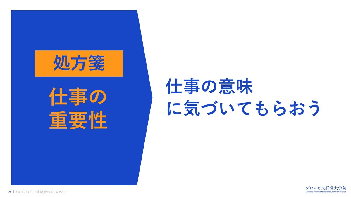 仕事の意味を見せてあげる。これはリーダーの優しさです。これは、ほぼお金もかかりません。ちょっとした工夫なんですよ。こういう介入が、細かいところでたくさんできます。これは会社の方針に関係なくできます。会社の制度に関係なくできます。会社の規制に関係なくできます。これが工夫です。仕事の意味に気づいてもらおう。シンプルですよね。