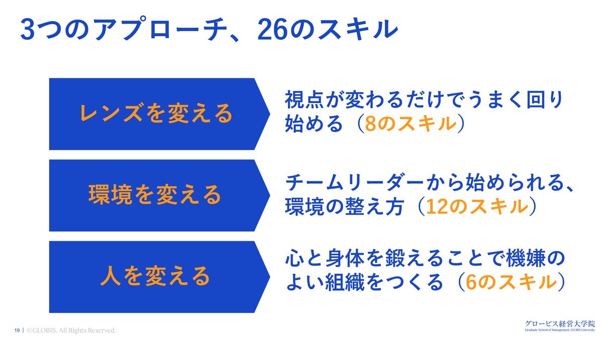 若杉忠弘氏(以下、若杉):じゃあ、どうすればいいのか。レンズを変える、環境を変える、人を変える。3つのアプローチ、合計26のスキルがあります。この中で、今日はいくつかをみなさんに紹介をしていきたいと思います。