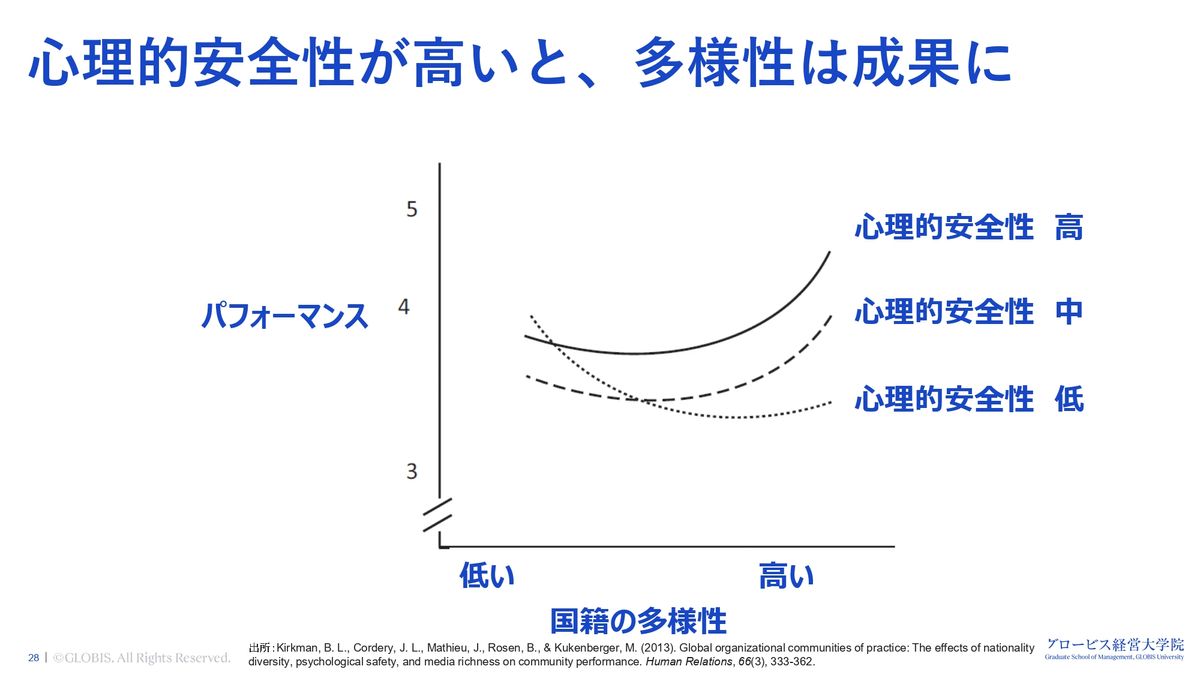 心理的安全性が高いと、多様性が成果につながっていきます。心理的安全性が高いチームで働いていると、どんどんパフォーマンスが上がってきます。