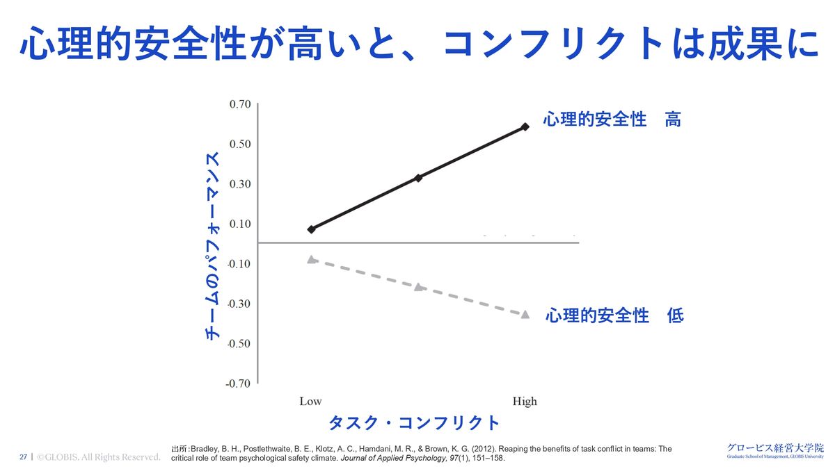 みなさんが心理的安全性の低いチームで働いていると、これが真逆に起きていきます。コンフリクトがあればあるほど、パフォーマンスが落ちてくるんですね。まさに、まったく違う道を歩んでいくことになります。
