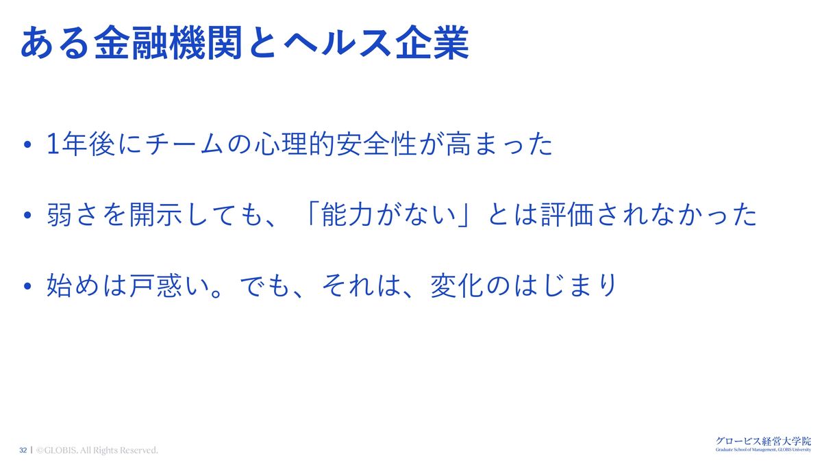 これをやった結果、金融機関、ヘルス関連企業、メディカル関連企業において1年後にチームの心理的安全性が高まったというデータがあります。それから、(上司が)弱みを開示しても、「能力がない」とは評価されませんでした。