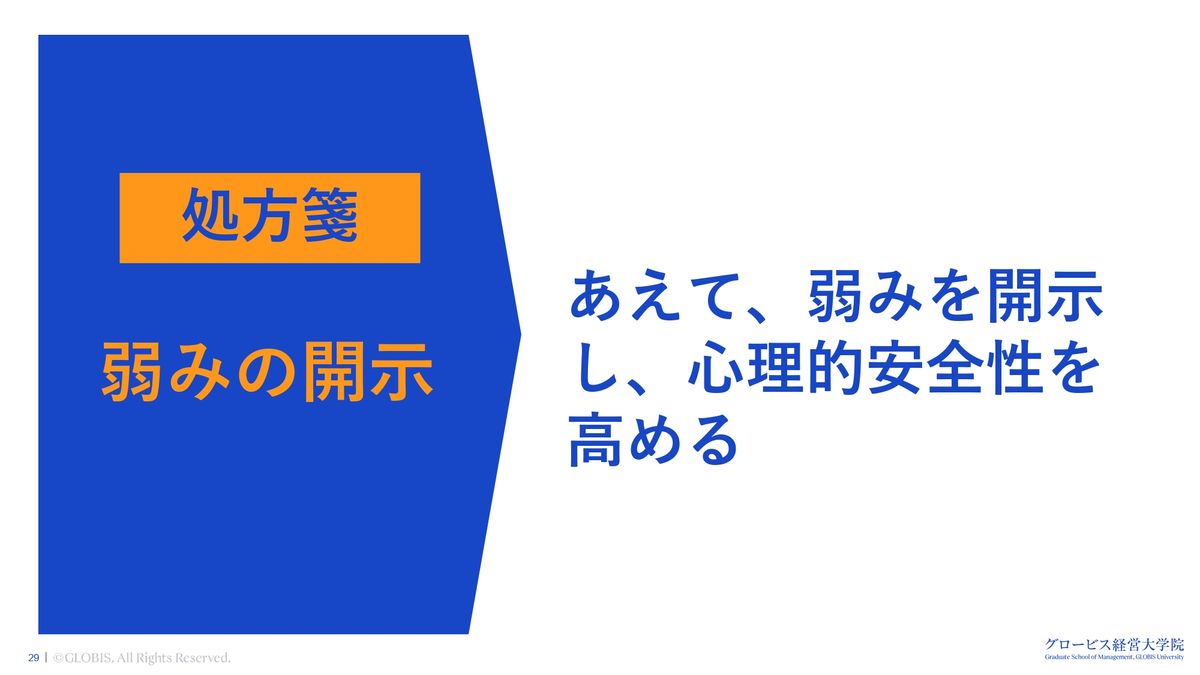 じゃあどうやって、この心理的安全性を高めるかということに、みなさんは悩んでいると思います。「え、具体的にどうするの?」と悩んだことはありませんか? (方法は)あえて「弱みを開示してください」ということです。「え、どうやって弱みを開示するんですか?」と思いませんでしたか? これはちゃんと、スクリプトを本に書いておきました(笑)。