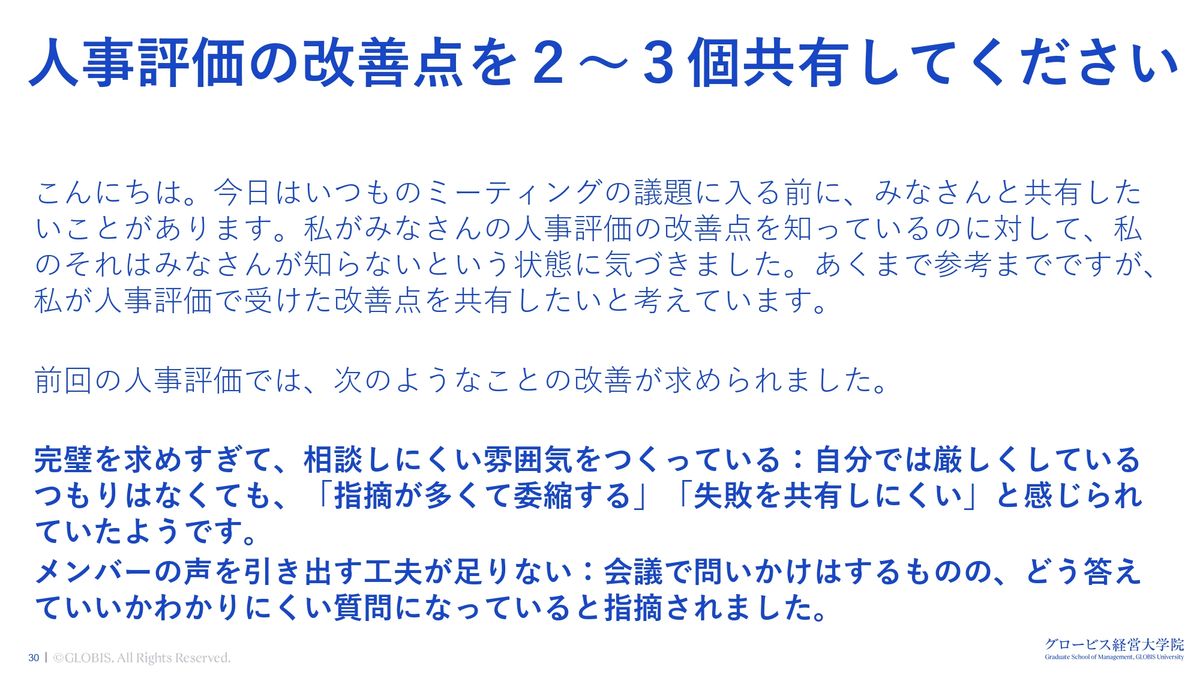 「私がみなさん(部下)の人事評価の改善点を知っているのに対して、私の改善点はみなさんが知らないという状態に気づきました」。だいたいそうですよね。上司であるリーダーは、部下の人事評価を知っています。じゃあ部下は、上司の人事評価を知っていますか? 知らないですよね。「あくまで参考までですが、私の人事評価の改善点を共有したいと思っています」ということです。