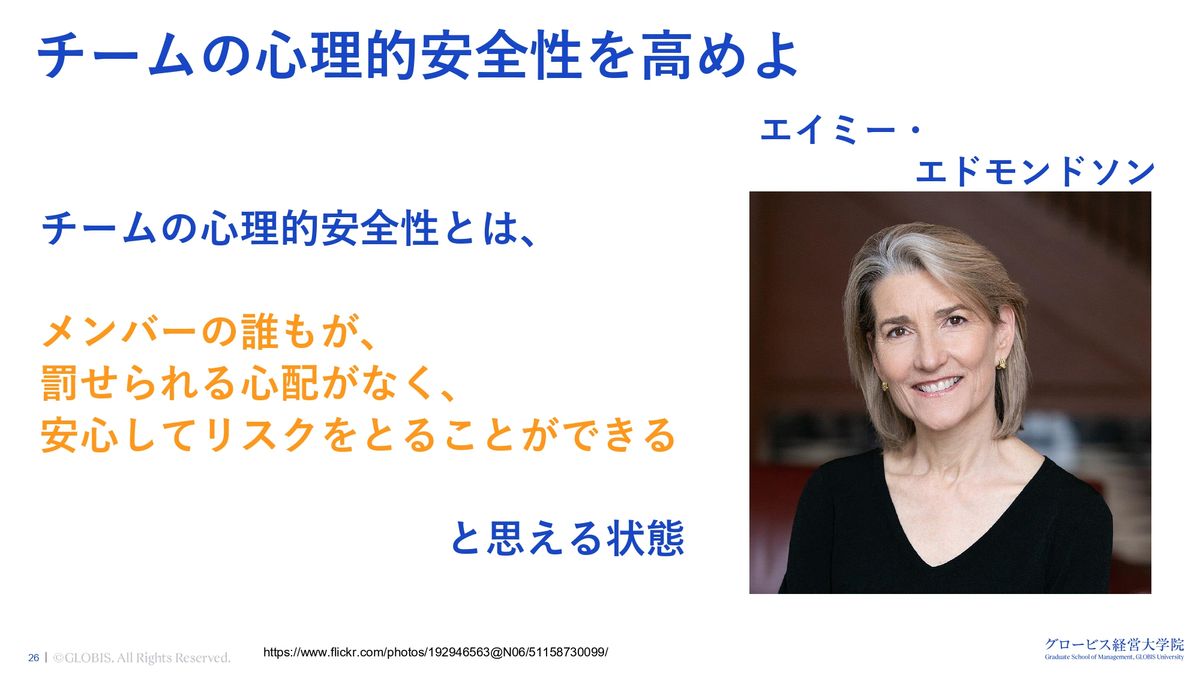 チームの心理的安全性は、ハーバード・ビジネススクールのエイミー・エドモンドソン教授が再定義をして、提案をしています。「チームの心理的安全性とは、メンバーの誰もが罰せられる心配がなく、安心してリスクを取ることができると思える状態」です。