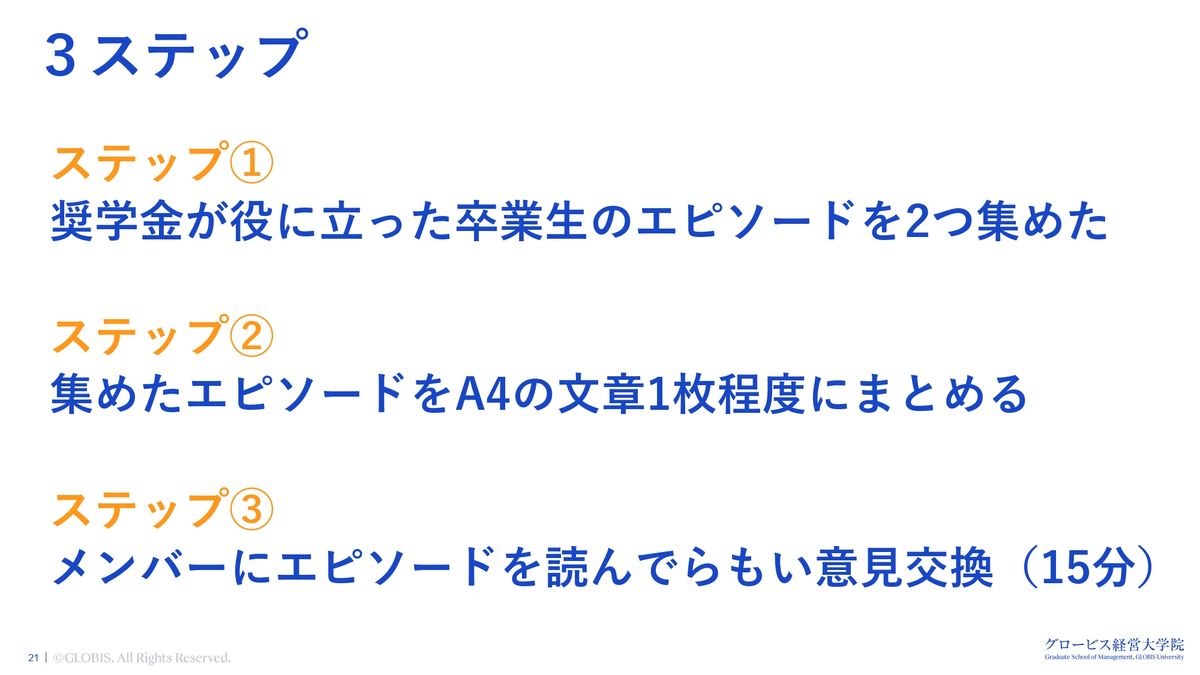 ここでやったことは何かというと、まず、奨学金が役に立った卒業生のエピソードを集めました。そして、集めたエピソードをA41枚程度にまとめました。それをコールセンターのスタッフに読んでもらいました。以上。