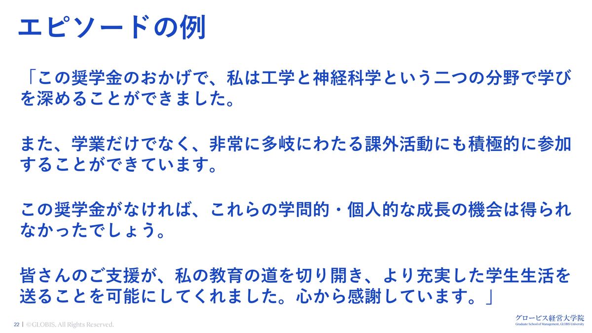 どういう文章かというと、こういうものです。「この奨学金のおかげで、私は工学と神経科学という二つの分野で学びを深めることができました。また、学業だけでなく、非常に多岐にわたる課外活動も、これによってできました。この奨学金がなければ、今の私はありません。こんなに成長の機会をくれて、ありがとうございます!」という、生の声。みなさん、コールセンターのスタッフとして働いていたとして、これを読んだらどう思いますか?