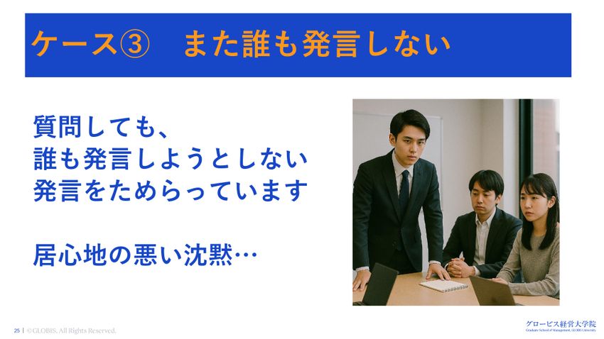 さぁ、こういうケースもありますね。「あ、また誰も発言していない」。リーダーが「みなさん、意見はありますか?」と聞きます。シーン。みんな俯いています。グロービスの学生はぜんぜんこういうことがないんですけどね(笑)。