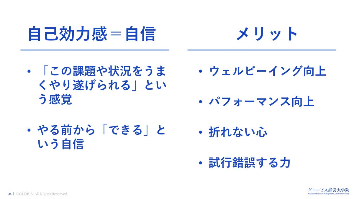 ・グロービス経営大学院の教員である若杉氏は「自己効力感は心理的資本の一つで、VUCA時代に適した心の筋肉である」と指摘しています。