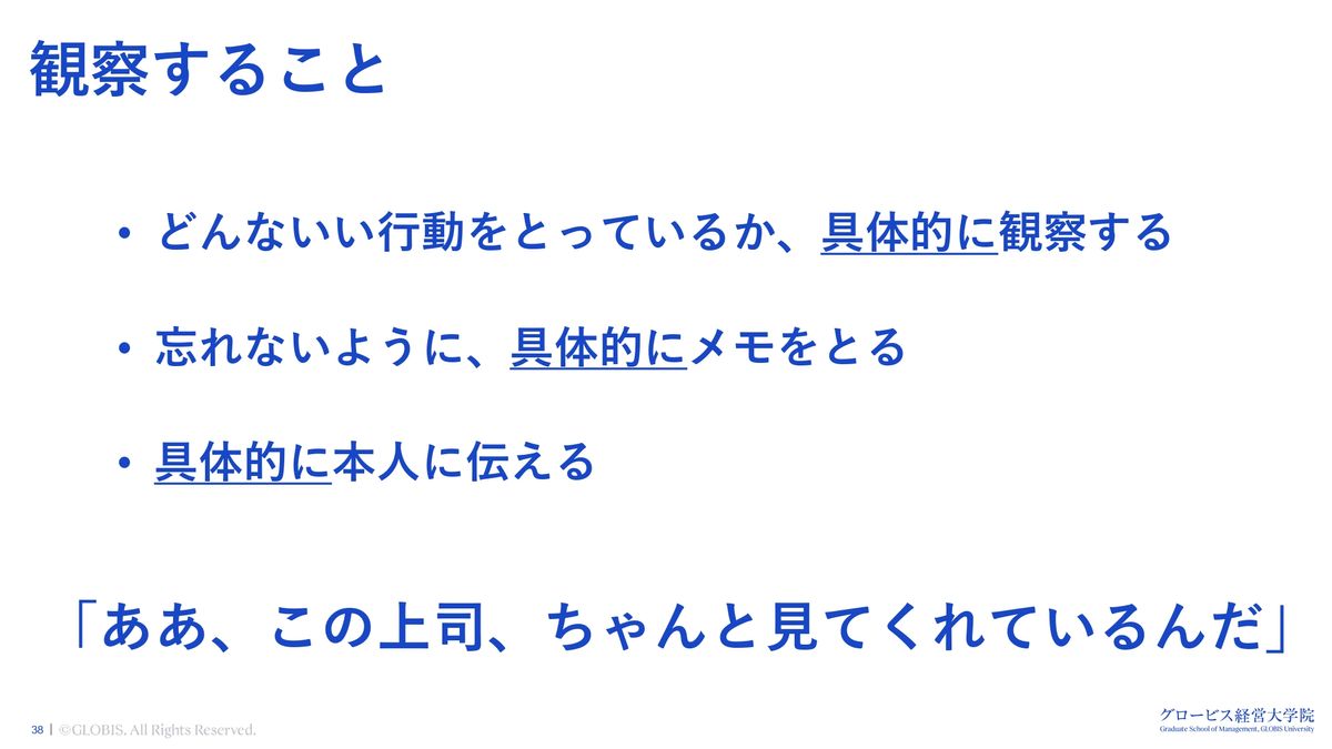 これは観察をしていないとできません。みなさん、今日交流したメンバーの良い行動、良い能力を具体的なレベルで3つ指摘できますか? なかなか難しいですよね。でも、観察すればできます。