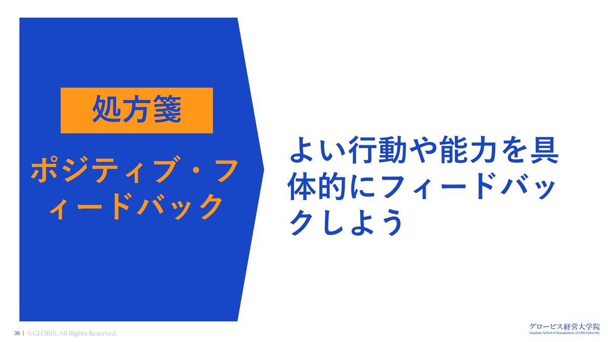 そうすると、メンバーは「あぁ、この上司は私のことをよく見ているんだ」と、絶対に思います。自己効力感が高まります。上司とメンバーの人間関係が良くなります。実はこの方法は、子育てにも使えます。というわけで、ポジティブ・フィードバック。良い行動や能力を具体的にフィードバックしようということですね。