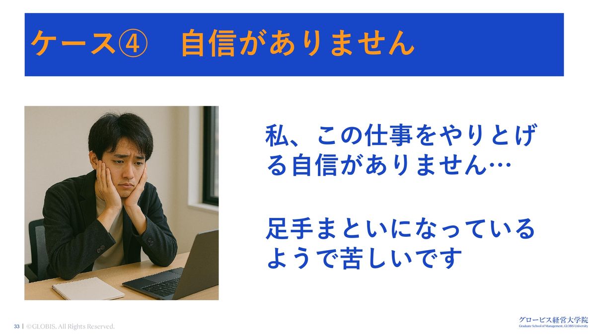 若杉忠弘氏:さぁ、ケース4にいきましょう。「自信がありません」。これはよく聞くお悩みです。「メンバーに自信がない、メンバーの自己肯定感が高くないのですがどうしましょう?」どうやったら、元気づけられるか。みなさんも悩んだことはありませんか? (部下から)「私、この仕事をやり遂げる自信がないんです」「足手まといになっているようで苦しいです」。