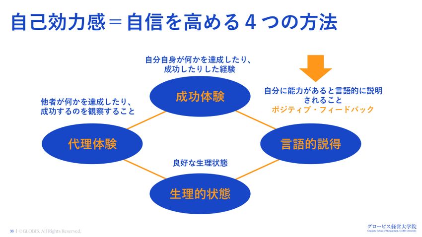さぁ、どうするかです。この自己効力感を高める方法は、実は4つあります。成功体験をすること。代理体験をすること、他者が何かを達成したり成功したりするのを観察すること。良好な生理状態、健康ですね。健康でいると、バイタリティになって自信が出やすいです。