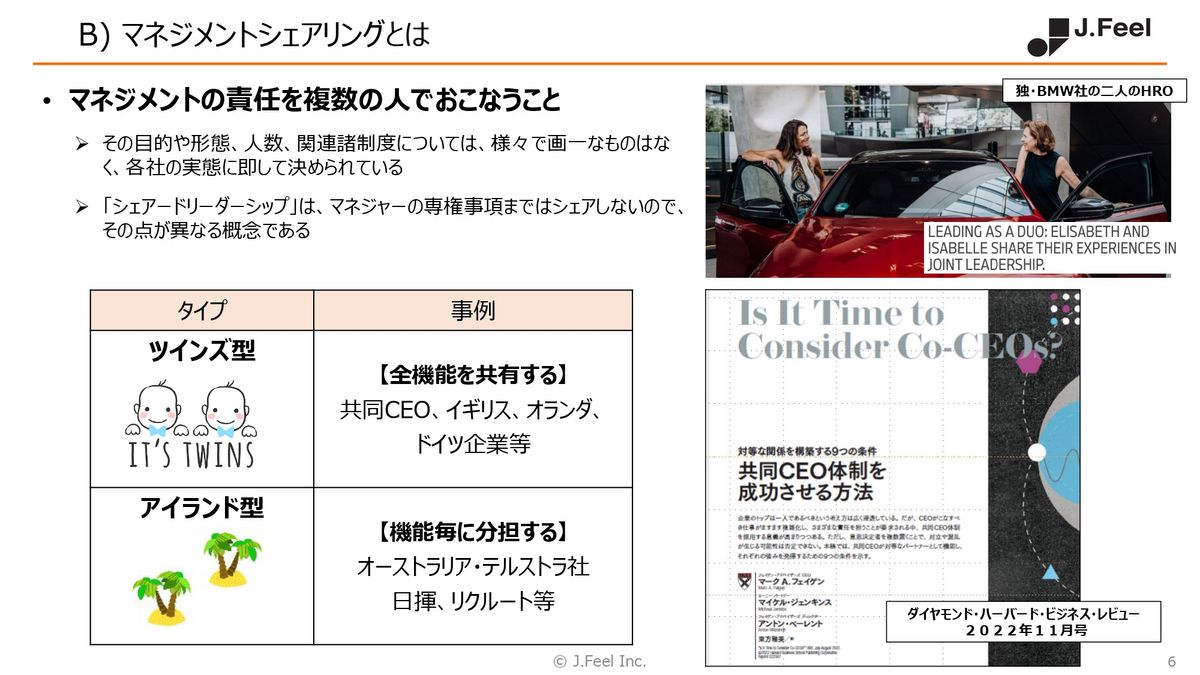 次のページなんですけれども、(スライドの)左下の表に「ツインズ型」「アイランド型」とあります。「ツインズ型」とはまさに「双子」というか、2人で1つのマネジメントや役職の全機能を担っていくかたちです。