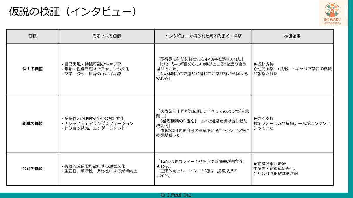 次に、こちらのスライドもインタビュー結果を先ほどと同様にそれぞれに想定される価値が何かをAIにまとめてもらいましたが、やはりこちらも参考程度となっております。検証は参考程度にとどめまして、私たちはそこからの対話を重視してまいりました。