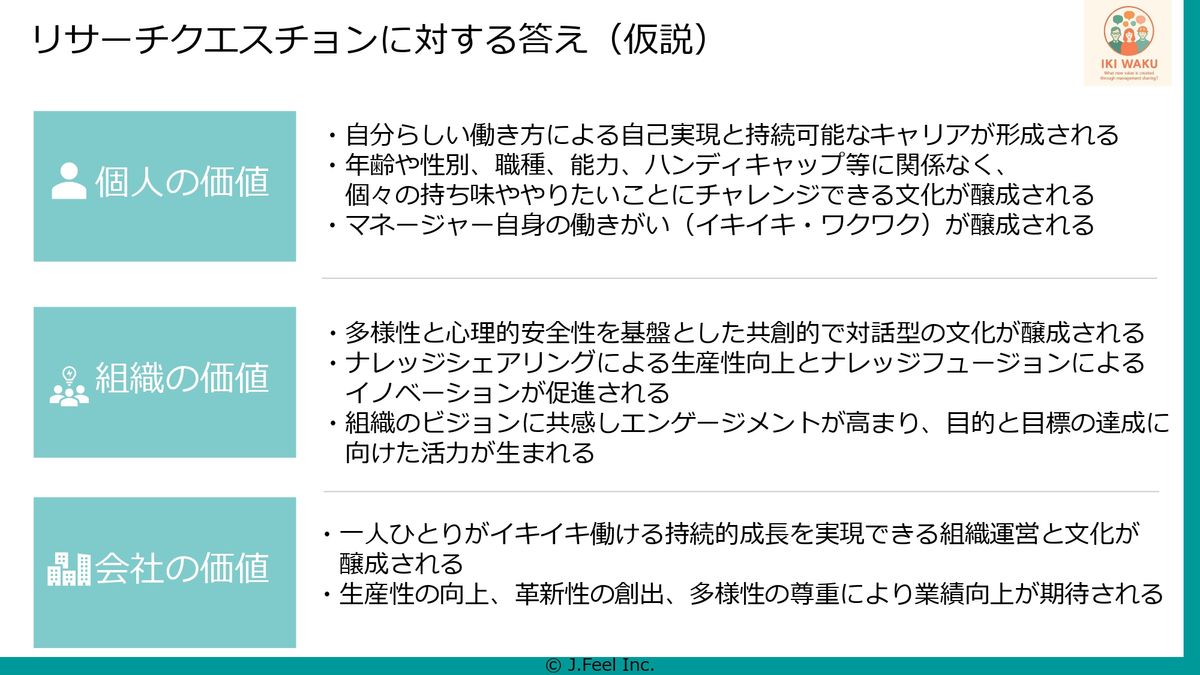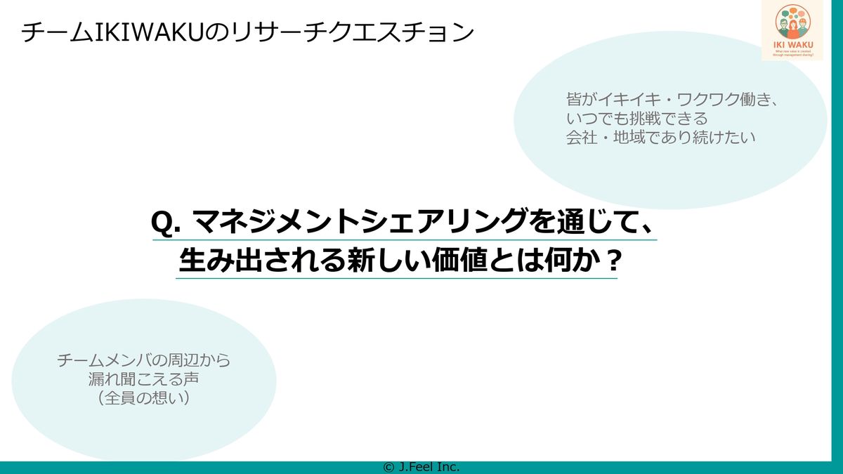 まずチームIKI WAKUのリサーチクエスチョンですが、「マネジメントシェアリングを通じて、生み出される新しい価値とは何か?」です。