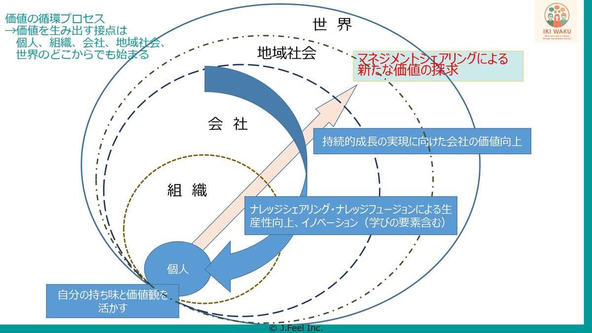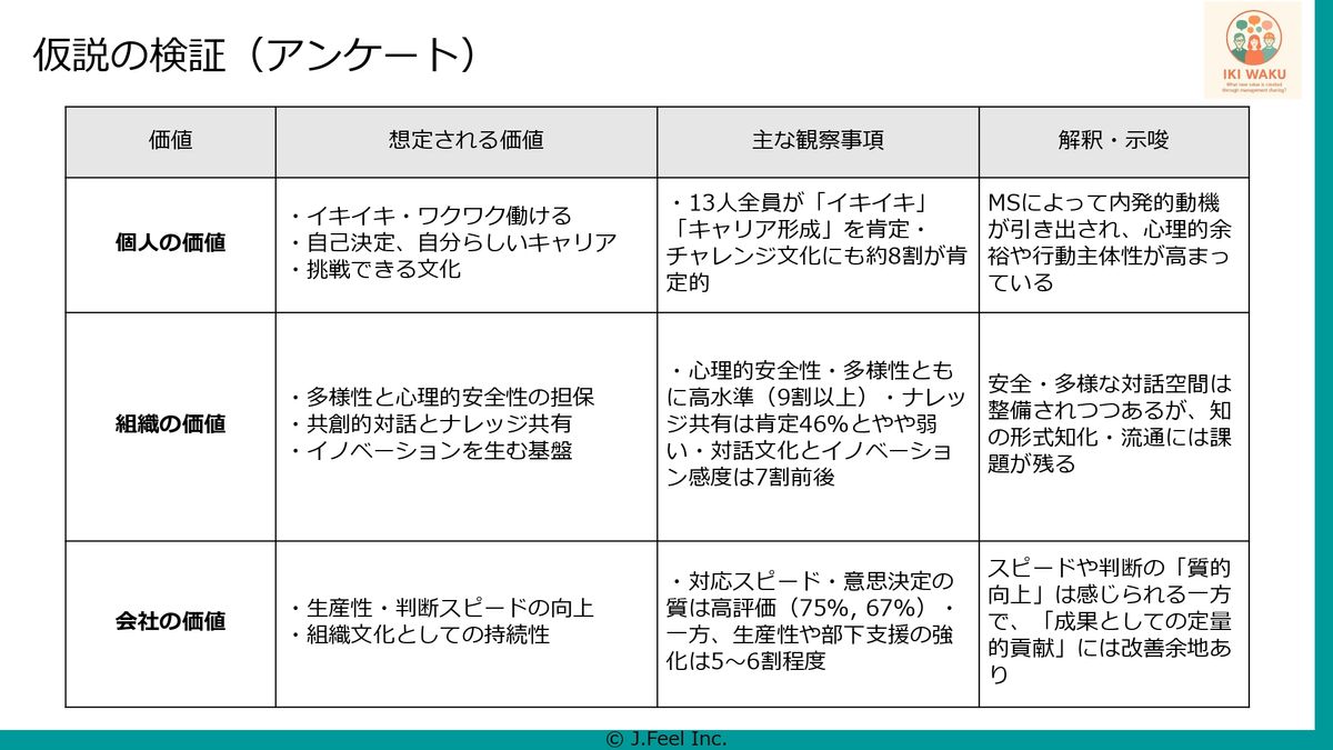 こちらのスライドなんですけれども、私たちの対話を表したものをちょっと作成してみました。先ほどのアンケートとインタビューは(経営チームがマネジメントシェアリングを実施している)ジェイフィールさんに協力いただきました。ここで田中さん、野平さん、水戸さんに、そのインタビューとアンケート、その後のチームIKI WAKUでの対話を通じて感じたことをお話しいただこうと思います。
