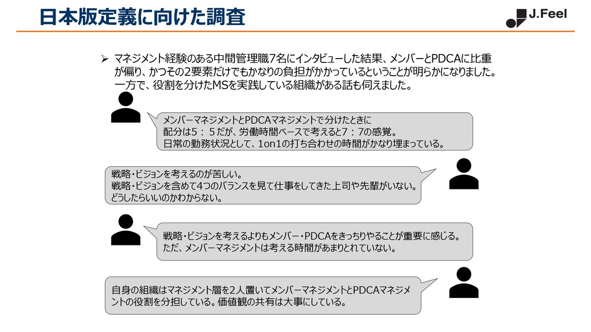 スライドの一番上のコメントは、経営側の視点というよりは、先ほどで言うと下段の現場視点が強いです。(本来の仕事量の合計が10だとすると、)メンバーマネジメントとPDCAマネジメントが5:5じゃなくて7:7で仕事をしており、合計が10を超えていて、実際はオーバーワークで非常に多忙だというところ。