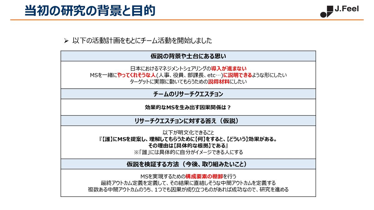 我々のチームはもともと、マネジメントシェアリングには非常に強い共感を持っていまして、ぜひ導入したいと。その中で、(今回の研究活動は、マネジメントシェアリング導入の)共感を高めるための説得材料にしたいと考えていました。