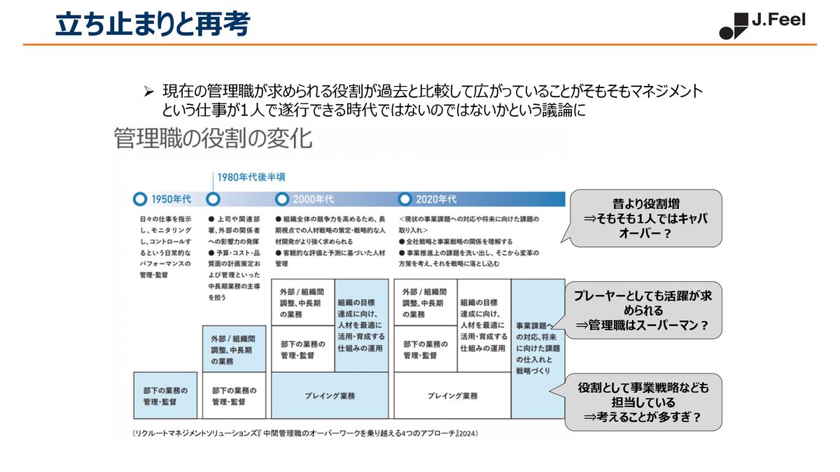 スライドの一番上のコメントは、経営側の視点というよりは、先ほどで言うと下段の現場視点が強いです。(本来の仕事量の合計が10だとすると、)メンバーマネジメントとPDCAマネジメントが5:5じゃなくて7:7で仕事をしており、合計が10を超えていて、実際はオーバーワークで非常に多忙だというところ。