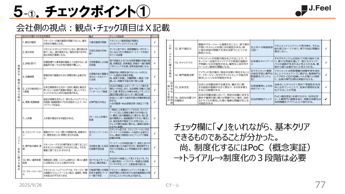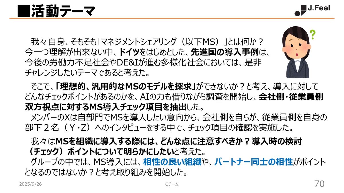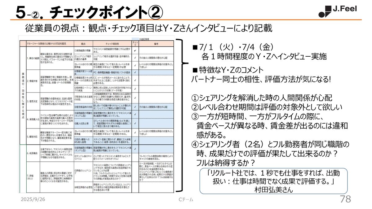 話者7:そこで(スライドの)真ん中の太字にありますが、「会社側はどういうことに気をつけたらいいんだろう?」とか「従業員側はどういうポイントがあるんだろう?」みたいなことをメンバーで話し合いました。私の会社にマネジメントシェアリングを入れたいという思いがありましたので、チェック項目を出して、それを使って私の会社でチェックしたという流れになっています。