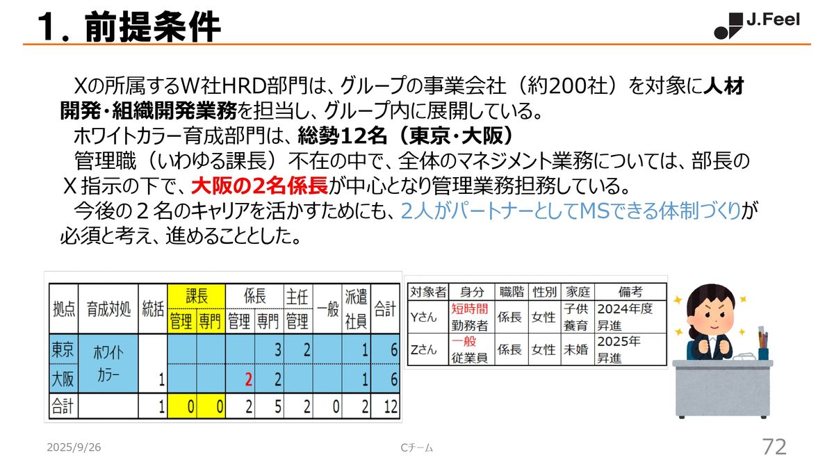 では次に、途中経過の報告をさせていただきます。私が所属する会社は物流系で、人材開発や組織開発の部門に私は属しておりまして、全部で総勢12名いるんですね。左下の表にありますけども、私が総括ということで部長をしております。