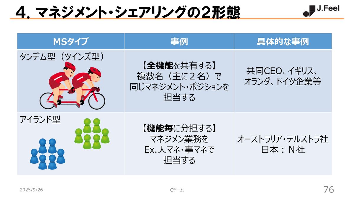 冒頭、重光さんからもお話がありましたけども、(マネジメントシェアリングには)タンデム方式、いわゆるツイン型と、アイランド型がありました。今回、私はタンデム方式を入れたいと思ったんです。その理由は、2人いれば何かあっても仕事が止まらないからです。