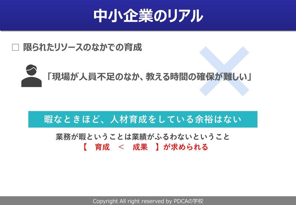 どういうことかというと、たぶん多くの企業さまでは「(部下を)育成しなさい」と会社から言われているけどできていない時って、ある程度売上の調子が良かったり、会社の調子が良い状態のことが多いと思うんですね。売上が下がっている会社さまもあるかもしれませんが、経営的打撃まではいっていない状態だと思っています。